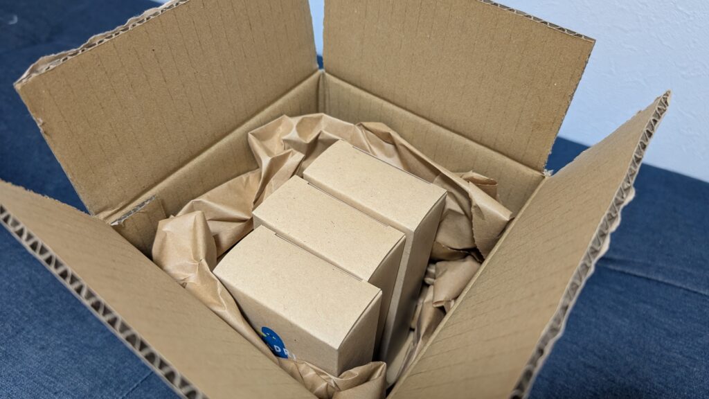今回は3本セットを購入しました。三辺合計が約52cmと思っていたよりコンパクトな段ボールでした。